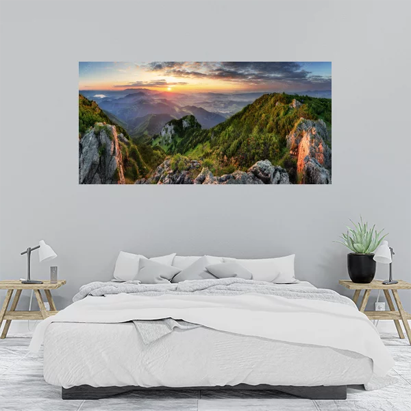 Obraz przedstawiający malowniczy pejzaż górski o wschodzie słońca to doskonały wybór do wnętrz. Widok rozciągających się pasm górskich, skąpanych w ciepłych promieniach słońca, emanuje spokojem i pięknem natury. Idealny do salonu, gdzie stworzy przytulną i relaksującą atmosferę, ale także znakomicie wpasuje się w klimat sypialni, wprowadzając harmonię i spokój.