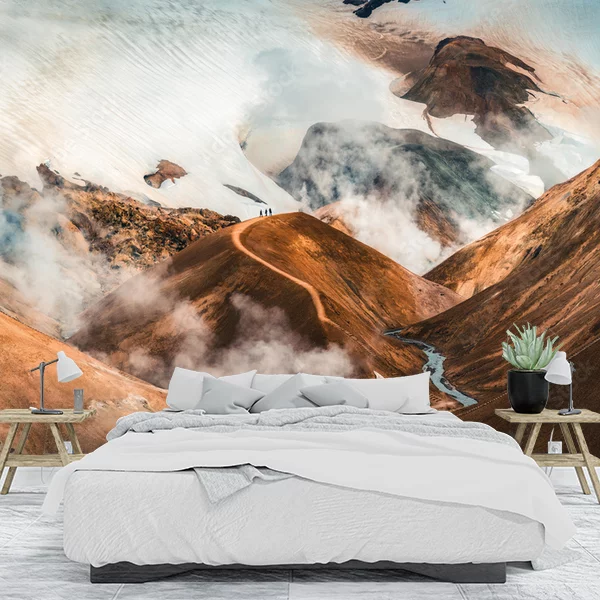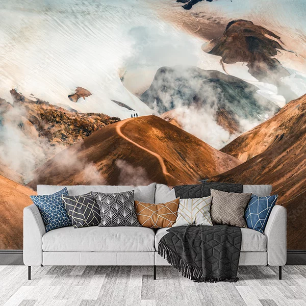 Ta fototapeta przedstawia malowniczy, górski krajobraz o surowym, ale spektakularnym pięknie. Dominuje tutaj kontrast między surowymi, brązowymi wzgórzami a białymi połaciami śniegu lub lodu. Mgła tajemniczo unosi się nad dolinami, dodając scenerii eterycznego uroku. Niewielki strumyk wije się pomiędzy wzgórzami, a delikatnie zarysowana ścieżka prowadzi przez zbocza. Na środku obrazu, na jednym z grzbietów widać sylwetki kilku osób, co daje wyobrażenie o skali tej monumentalnej przyrody. Taka tapeta wprowadza do wnętrza spokój i poczucie przestrzeni. Idealna dla miłośników przyrody i podróży.