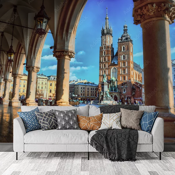 Obraz lub fototapeta na ścianę przedstawia malowniczy widok rynku w historycznym mieście. W centralnej części obrazu dominuje monumentalna, gotycka katedra z dwiema strzelistymi wieżami, która przyciąga wzrok swoją architekturą. Na pierwszym planie widoczne są masywne kolumny podcieni budynku, które tworzą eleganckie arkady. Przez te kolumny można dostrzec plac z rzeźbą i przechodniami, wypełniony atmosferą tętniącego życiem miasta. Bogate detale architektoniczne, gra światła i cieni oraz ciepłe barwy nadają scenie wyjątkowy urok i historyczny charakter. Taki obraz doskonale ożywi wnętrze, dodając elegancji i inspirującego klimatu związanych z zabytkowymi miejscami.