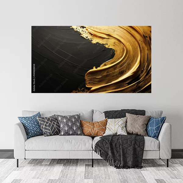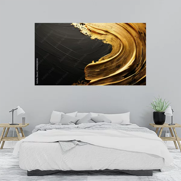 Obraz przedstawia nowoczesną kompozycję, w której dominuje abstrakcyjny motyw. Na czarnym tle wyrazista, złota smuga przyciąga wzrok swoją dynamiką i elegancją. Ten drukowany na płótnie obraz jest idealnym uzupełnieniem do wnętrz w stylu minimalistycznym lub nowoczesnym. Doskonale sprawdzi się jako centralny element dekoracyjny do salonu lub sypialni, nadając pomieszczeniu luksusowego charakteru.