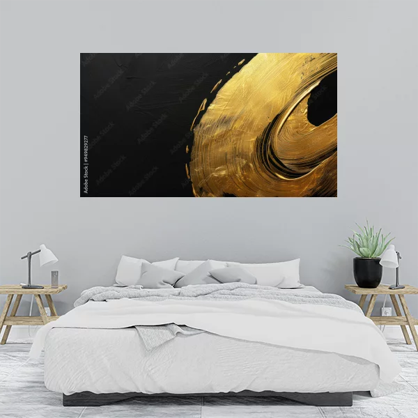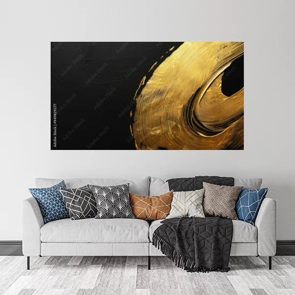 Obraz przedstawia nowoczesną kompozycję abstrakcyjną, idealną do wnętrz takich jak salon czy sypialnia. Dominują na nim ciemne tony przełamane złotym, dynamicznym akcentem, który dodaje elegancji i luksusu. Ta dekoracja ścienna to świetny sposób, by wzbogacić wystrój wnętrza, wprowadzając artystyczny akcent.
