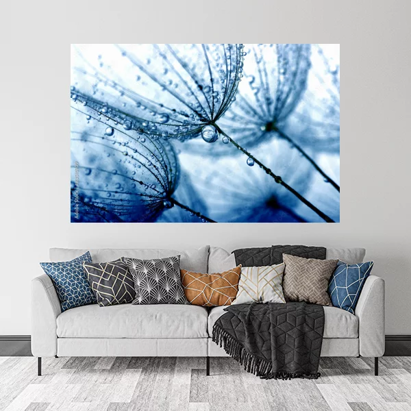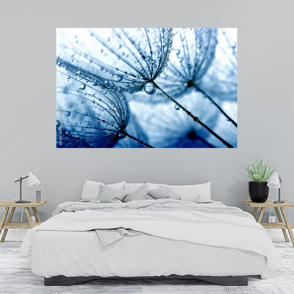 Elegancki i nowoczesny obraz przedstawiający makrofotografię delikatnych nasion dmuchawca pokrytych kroplami rosy. Obraz utrzymany w odcieniach błękitu, co nadaje mu chłodny, ale jednocześnie spokojny i relaksujący charakter. Dzięki zaostrzonym detalom i wysokiej rozdzielczości, każdy element nasion i kropel wody jest wyraźnie widoczny, co sprawia, że obraz przyciąga wzrok swoją unikatową kompozycją. Obraz idealny do nowoczesnych wnętrz, nadająca się zarówno do salonów, sypialni, jak i biur, tworząc atmosferę świeżości i naturalnego piękna.