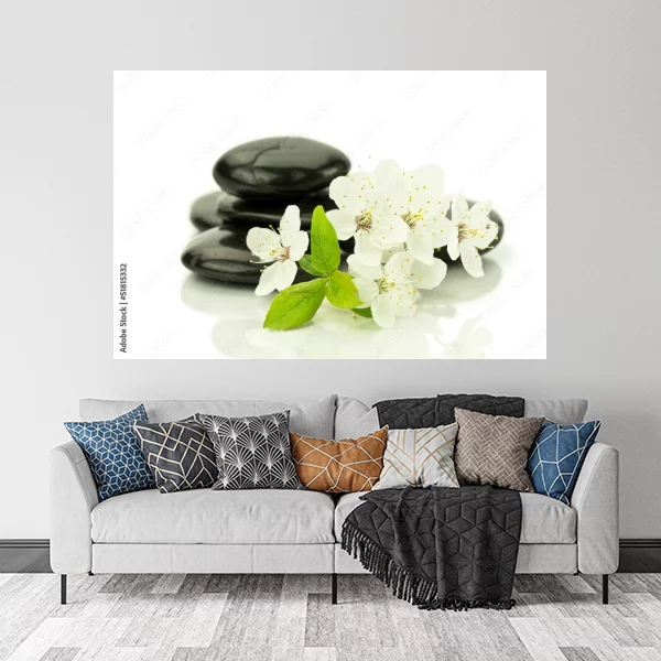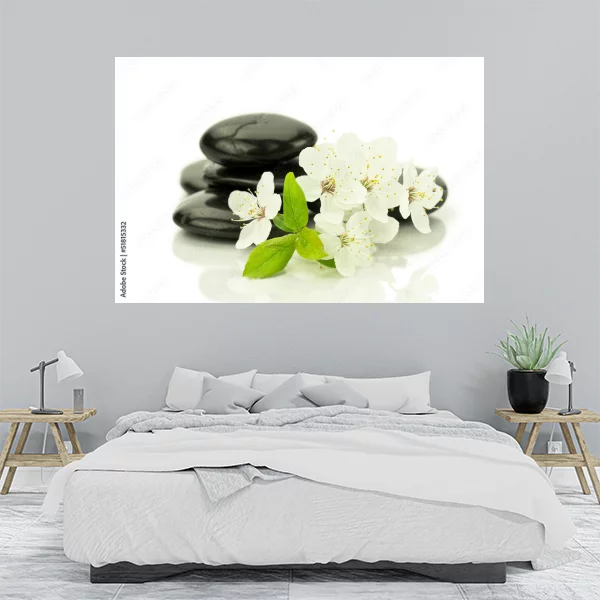Obraz przedstawia stos gładkich, czarnych kamieni leżących w tle oraz biało-kremowe kwiaty z zielonymi liśćmi na ich pierwszym planie. Całość kompozycji utrzymana jest w stylu zen, co nadaje jej harmonijny, uspokajający charakter. Idealny do zawieszenia na ścianie w miejscach przeznaczonych do relaksu, takich jak spa, łazienka czy salon.