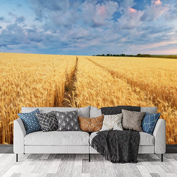 Na fototapecie przedstawiona jest rozległa, złocista pole pszenicy w czasie dojrzałości zboża. Poprzez środek pola biegnie ścieżka pozostawiona przez maszynę rolniczą lub pieszych, prowadząca w głąb horyzontu. Niebo nad polem jest częściowo pokryte chmurami, a w prawym górnym rogu obrazu widzimy wschodzące lub zachodzące słońce, którego ciepłe promienie rozświetlają krajobraz. Kolory na tapecie są żywe, co wprowadza poczucie spokoju i natury. Taka fototapeta może stanowić idealną dekorację ścienną, wprowadzając do wnętrza element natury i przestronności.
