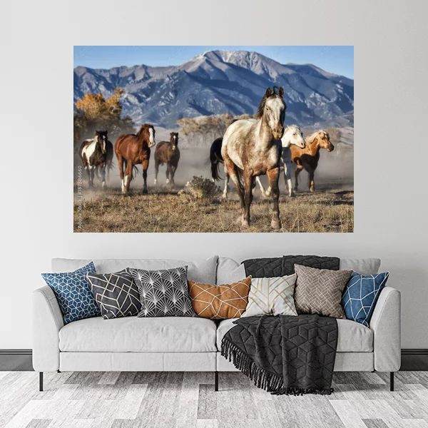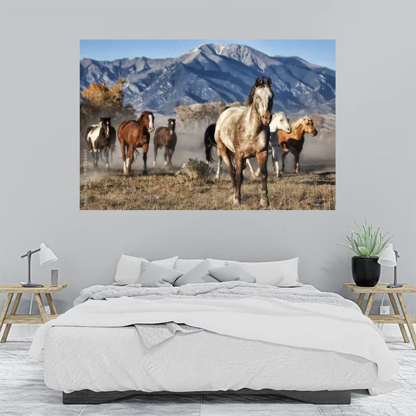 Obrazek to piękna scena przedstawiająca stado koni galopujących na tle majestatycznych gór. Dominują tutaj naturalne kolory ziemi, które wspaniale wkomponują się w wystrój wnętrz. Idealnie nadaje się do salonu, gdzie stanie się centralnym punktem, przyciągającym uwagę gości. Sprawdzi się także w sypialni, wprowadzając spokój i harmonię.
