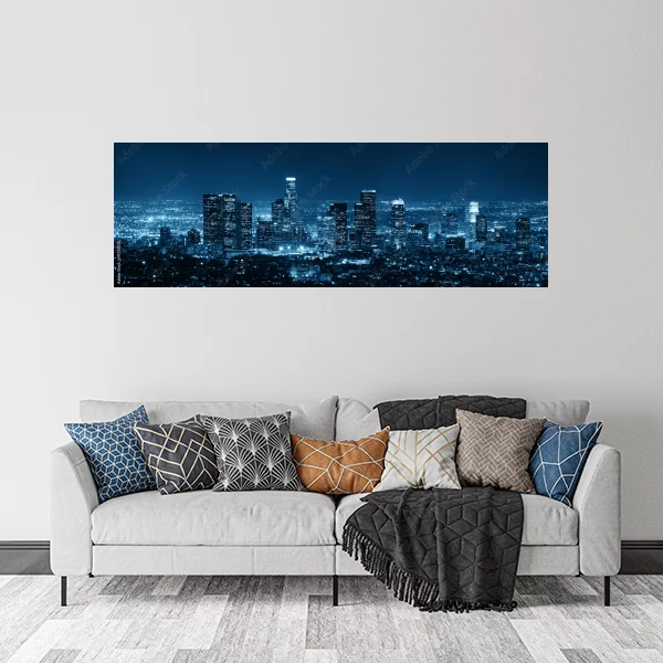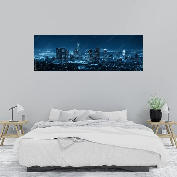 Ten obrazek przedstawia panoramiczny widok na nocną panoramę miasta, z oświetlonymi wieżowcami w centrum. Doskonale nadaje się jako stylowy dodatek do wnętrz, szczególnie do salonu lub sypialni, gdzie może stanowić główny akcent dekoracyjny.