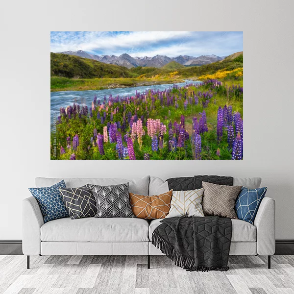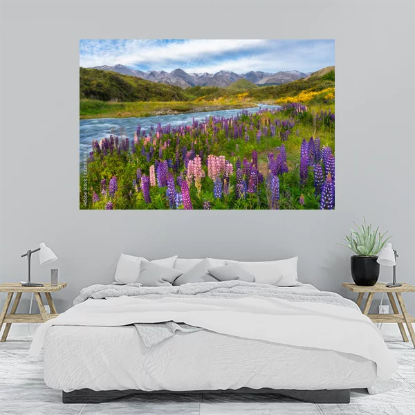 Obraz na płótnie przedstawia malowniczy krajobraz, który idealnie nadaje się do wnętrz, zarówno do salonu, jak i do sypialni. W centrum kompozycji znajduje się przepływająca rzeka, otoczona bujną roślinnością, a dominują nad nią majestatyczne góry w tle. Kwiaty w intensywnych odcieniach fioletu i różu dodają kompozycji żywiołowości i naturalnego piękna.