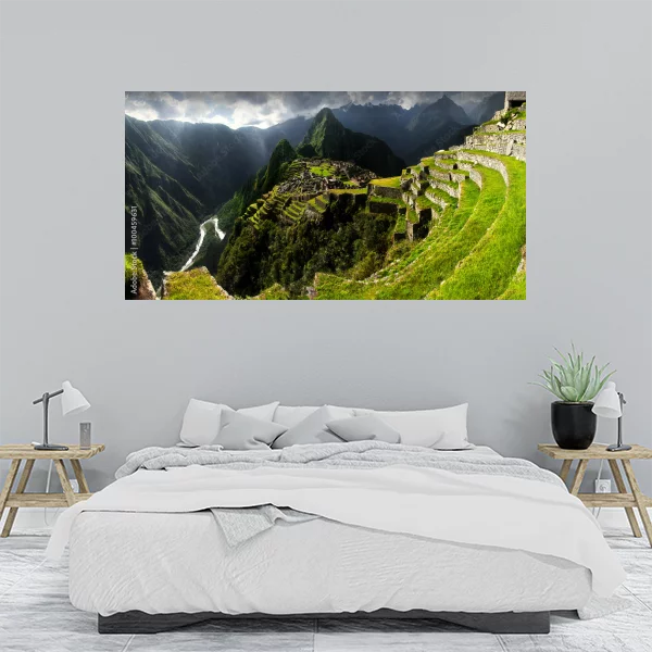Obraz przedstawia malowniczy widok Machu Picchu, starożytnego miasta Inków położonego w Peru. Na pierwszym planie widoczne są charakterystyczne tarasowe pola i kamienne konstrukcje. Krajobraz otaczają majestatyczne góry pokryte bujną zielenią. Całość skąpana jest w dramatycznym świetle, które podkreśla tajemniczy i historyczny charakter tego miejsca. Idealny obraz, który wprowadza egzotyczny i inspirujący nastrój do wnętrza.