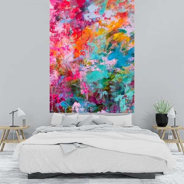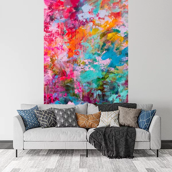 Obraz na płótnie przedstawia abstrakcyjny kalejdoskop kolorów, który przyciąga wzrok swoją intensywnością i żywiołowością. Dominują na nim energetyczne odcienie różu, pomarańczy i turkusu, tworzące dynamiczne połączenia. Ich zderzenie z chłodniejszymi tonami zieleni i błękitu dodaje całości harmonię i równowagę.