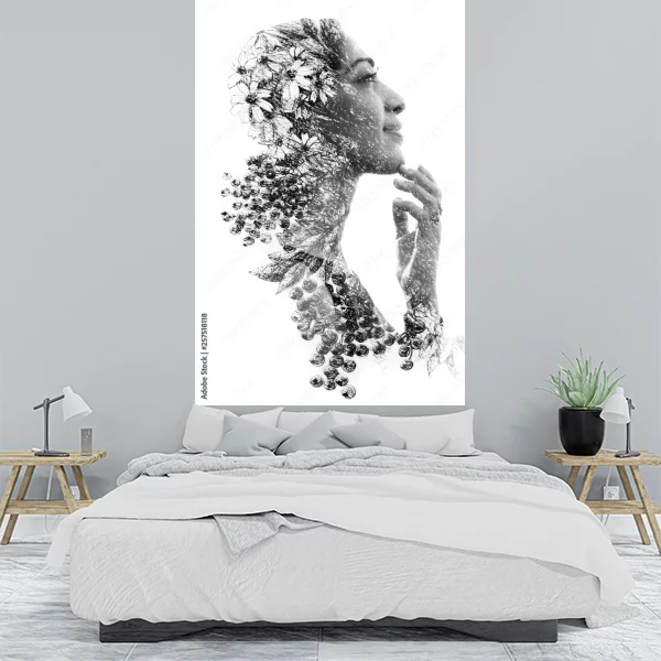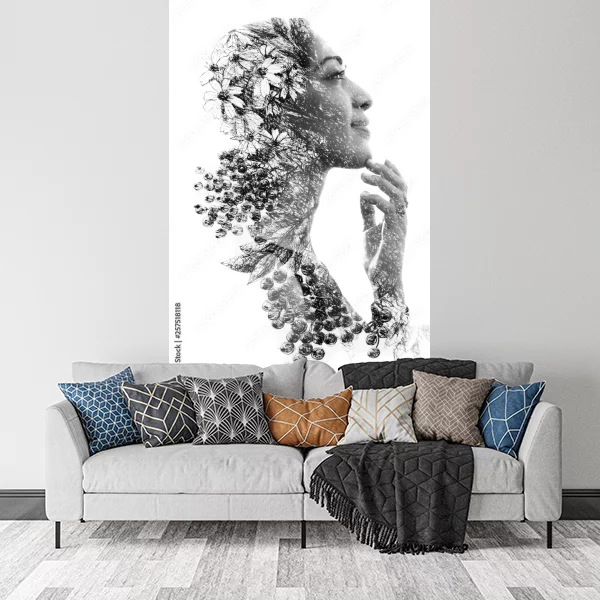 Na tym obrazie, który idealnie nadaje się jako dekoracja na ścianę, widzimy subtelną kompozycję wykorzystującą technikę podwójnej ekspozycji. Profil kobiety jest delikatnie zarysowany, a jej twarz wyraża spokój i zamyślenie. Włosy postaci płynnie przechodzą w motywy roślinne, tworząc harmonijną fuzję człowieka i natury.