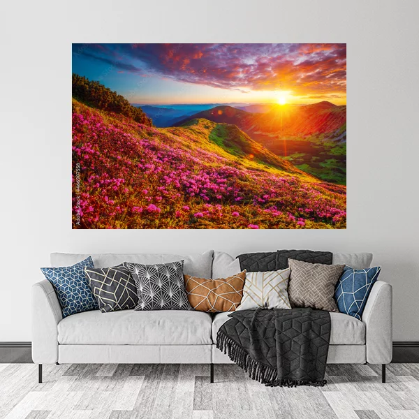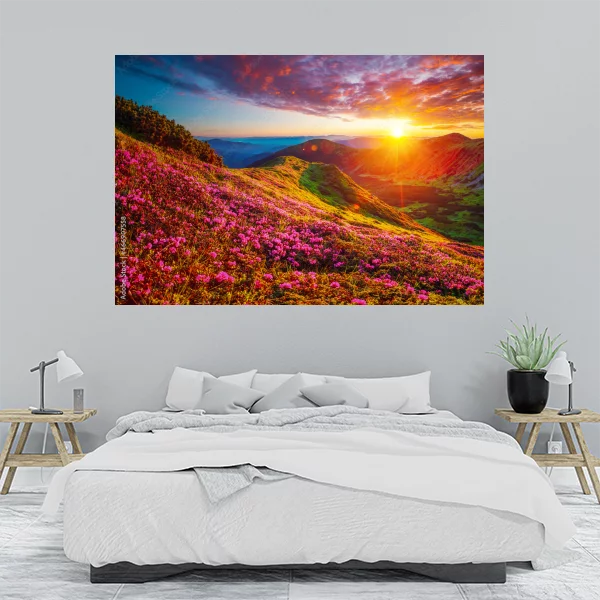 Na obrazie przedstawiona jest malownicza górska sceneria o zachodzie słońca, która z pewnością urozmaici każde wnętrze. Intensywne kolory zachodzącego słońca tworzą ciepłą i przytulną atmosferę, idealną do salonu lub sypialni. Widoczna panorama gór z kwitnącą, różnobarwną roślinnością nadaje kompozycji dynamiki i życia, co sprawia, że obraz przyciąga wzrok i staje się centralnym punktem dekoracyjnym.