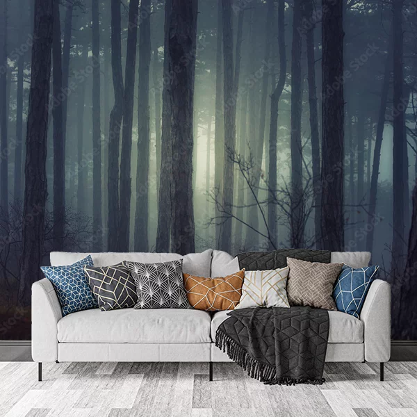 Fototapeta przedstawia mistyczny las, w którym wysokie, smukłe drzewa wznoszą się ku niebu. Atmosfera jest tajemnicza i nieco mglista, co dodaje głębi oraz sprawia wrażenie, że las jest nieskończony. Promienie światła przedzierają się przez drzewa, tworząc delikatną poświatę. Kolory są stonowane, z przewagą ciemnych odcieni zieleni i szarości, co nadaje obrazowi spokojny, medytacyjny charakter. Taka fototapeta idealnie nadaje się do stworzenia relaksującej przestrzeni w pomieszczeniu.