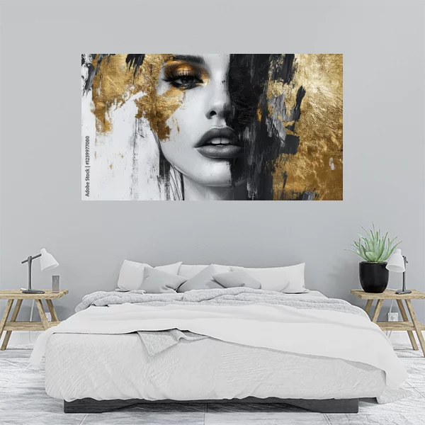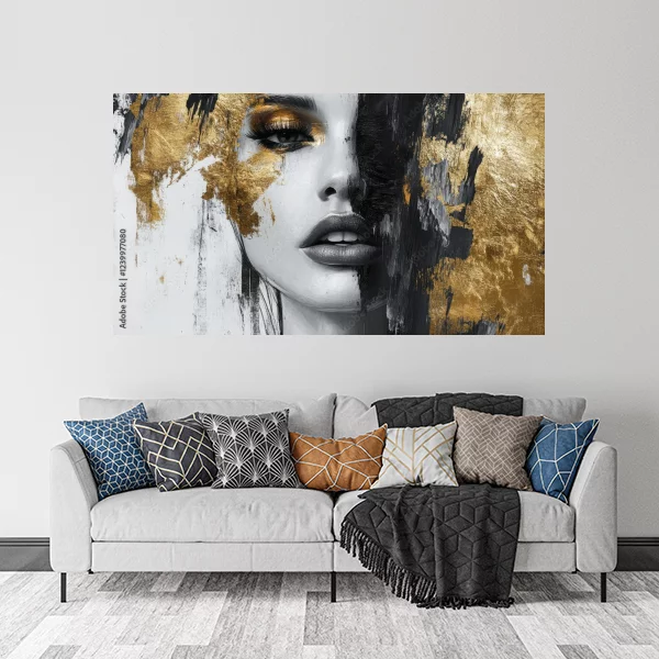 Ten nowoczesny obrazek, dostępny jako druk na płótnie, idealnie nadaje się do wnętrz, szczególnie do salonu czy sypialni. Dominują na nim odcienie złota i czerni, co nadaje mu elegancki i intrygujący charakter. Twarz kobiety, subtelnie wyłaniająca się z abstrakcyjnych, złocistych i czarnych pociągnięć, przyciąga wzrok swoją tajemniczością.