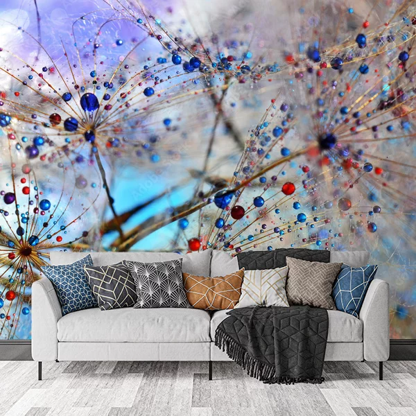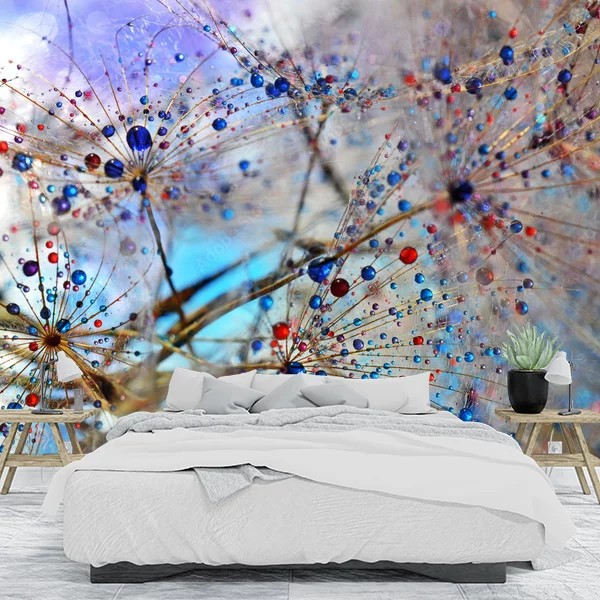 Na obrazie przedstawiona jest artystyczna kompozycja makrofotografii. Widać na niej zbliżenie na delikatne struktury roślinne, które przypominają dmuchawce. Gałązki są ozdobione perłami kropli wody, z których każda kropla odbija światło, tworząc efektowny, kolorowy obraz z odcieniami niebieskiego, czerwonego i fioletowego. Tło jest rozmyte, co nadaje obrazowi głębi i podkreśla detale roślin.