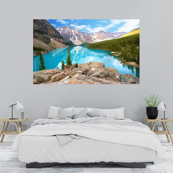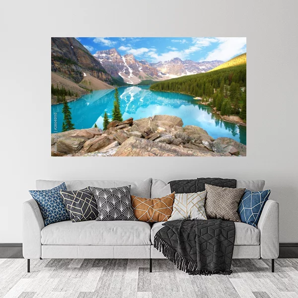 Obraz na płótnie przedstawia malowniczy widok góry z krystalicznie czystym jeziorem w sercu natury. Błękitna woda doskonale odbija majestatyczne szczyty górskie, a otaczające je zielone lasy wprowadzają harmonię do tego zapierającego dech w piersiach krajobrazu. Błękitne niebo z białymi chmurami w tle dodaje całości głębi i przestrzeni. Idealny element dekoracyjny, który doda wnętrzu naturalnej, uspokajającej atmosfery.