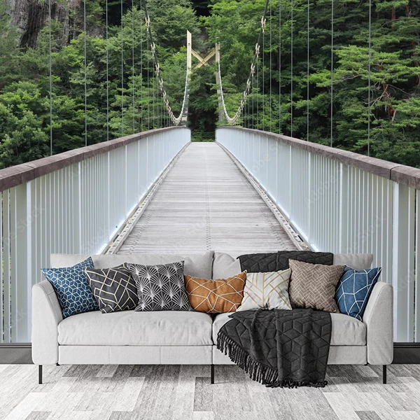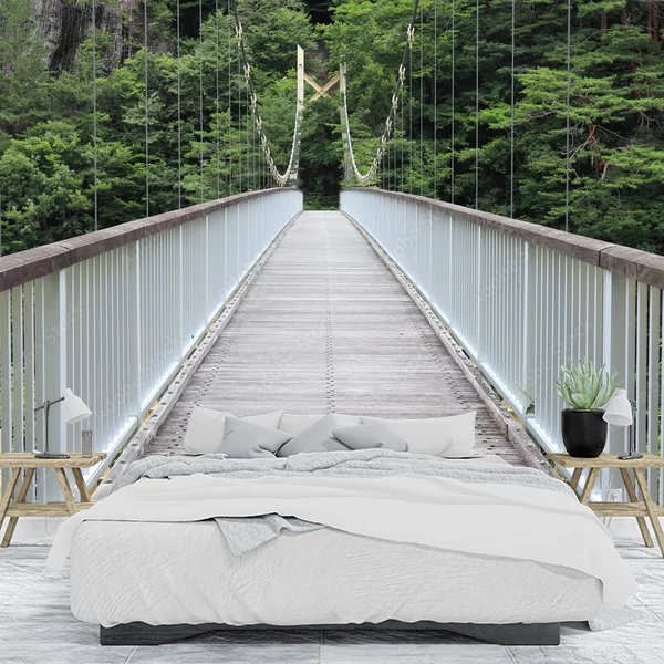 Fototapeta przedstawia zawieszony most wiszący, który prowadzi przez zalesioną okolicę. Most jest wykonany z drewna i posiada białe barierki z obu stron, zapewniające bezpieczeństwo przechodniom. Zdjęcie wykonane jest w kierunku prosto przed siebie, co daje wrażenie głębi i prowadzi wzrok w głąb lasu. Tło wypełniają liczne, bujne drzewa, które nadają scenie spokojny, naturalny charakter. Most stanowi centralny punkt obrazu, podkreślając jego strukturalne piękno i stabilność, a otaczająca przyroda dodaje harmonii i spokoju. Taka fototapeta idealnie wpasuje się do wnętrz miłośników natury, wprowadzając do pomieszczenia świeżość i poczucie bliskości z przyrodą.