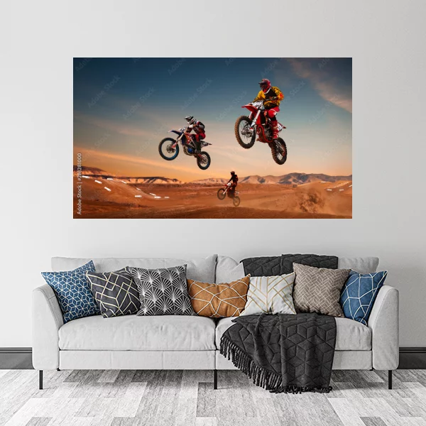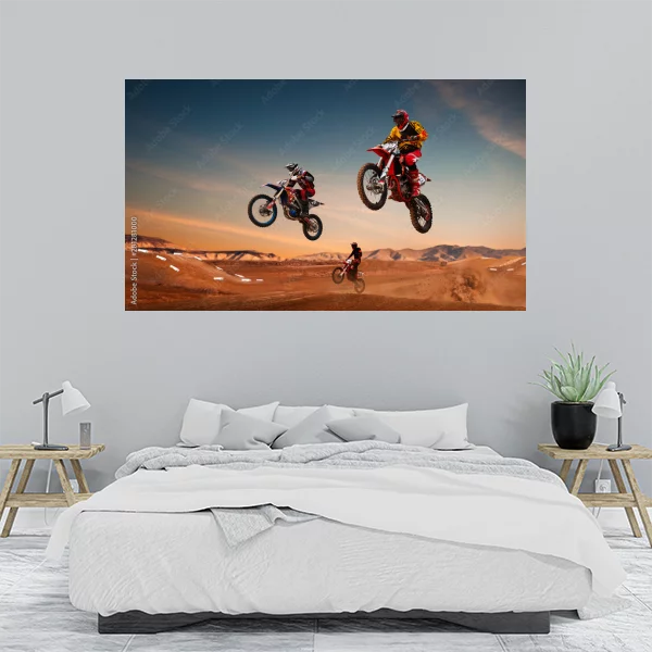 Obraz przedstawia dynamiczną scenę motocrossową, gdzie trzech motocyklistów w pełnym sprzęcie ochronnym wykonuje widowiskowe skoki na swoich motocyklach. Tło stanowią malownicze, piaszczyste wydmy i góry, a niebo o zmierzchu z różowo-złotymi pasmami dodaje dramatyzmu całej kompozycji. To idealny produkt na ścianę dla miłośników adrenaliny i sportów ekstremalnych, który uchwyci ducha przygody i rywalizacji.