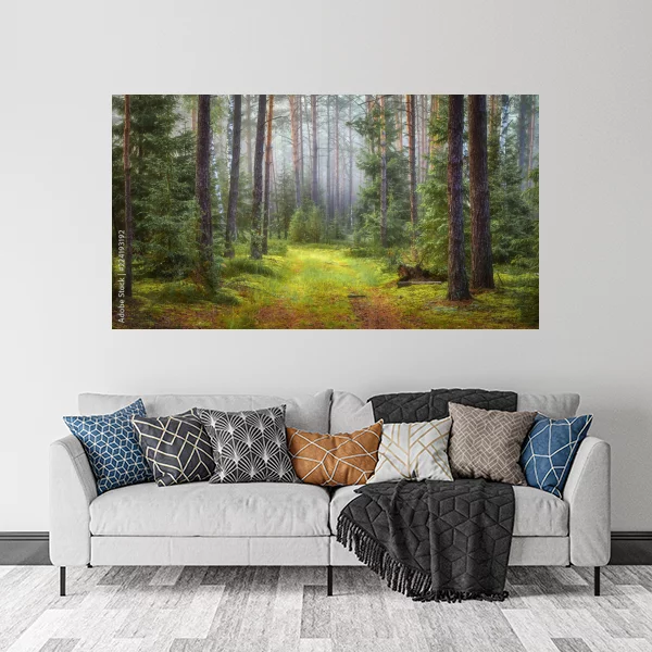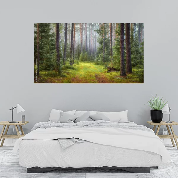 Obraz przedstawia malowniczą, leśną scenerię, idealną do dekoracji wnętrz. Prześwitujące przez drzewa światło oraz soczysta zieleń trawy wprowadzają atmosferę spokoju i harmonii, co czyni go doskonałym wyborem do salonu czy sypialni. Kompozycja leśnej ścieżki prowadzi wzrok w głąb obrazu, zachęcając do chwili refleksji.