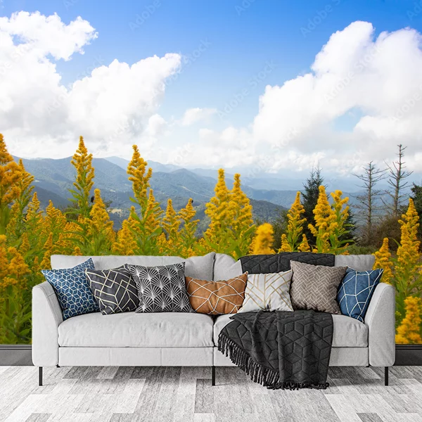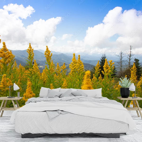 Na pierwszym planie widoczne są bujne, żółte kwiaty, prawdopodobnie nawłoci, rozciągające się w kierunku horyzontu. W tle widać malownicze góry pod błękitnym niebem z delikatnymi, białymi chmurami. Połączenie intensywnych kolorów kwiatów z naturą tworzy harmonijny krajobraz, idealny do wprowadzenia świeżości i energii do wnętrza. To piękne ujęcie natury niesie ze sobą spokój i poczucie przestrzeni, co czyni je doskonałym wyborem na fototapetę.
