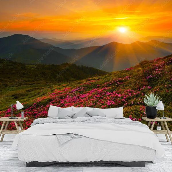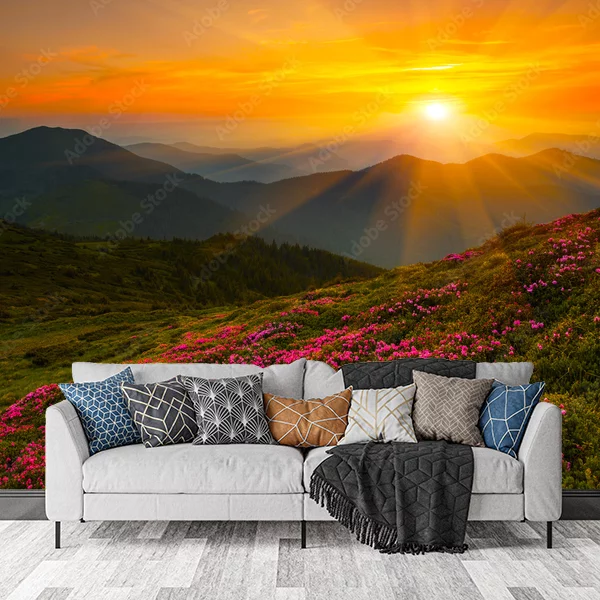 Fototapeta przedstawia malowniczy krajobraz górski o zachodzie słońca. Na pierwszym planie widoczne są soczyście zielone wzgórza pokryte bujnym kobiercem różowych kwiatów. W tle wyrastają majestatyczne, falujące sylwetki górskich szczytów, tworząc piękną, wielowarstwową kompozycję. Złociste promienie słońca przenikają przez niebo, malując je ciepłymi odcieniami pomarańczu i żółci. Sceneria emanuje spokojem i zachwyca swoją naturalną urodą, idealnie nadającą się do wprowadzenia relaksującego klimatu w domowym wnętrzu.