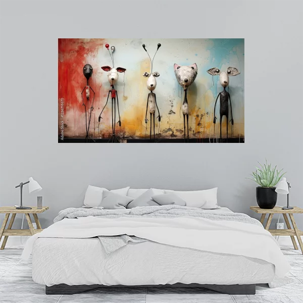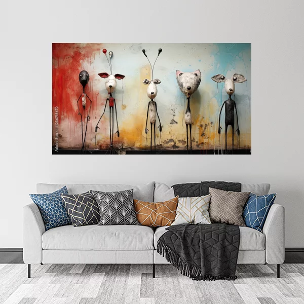 Ten obrazek, idealny jako dekoracja ściany w nowoczesnych wnętrzach, pełen jest intrygujących, fantastycznych postaci przypominających zwierzęta. Stylizowane na rzeźby figury o różnych kształtach i kolorach wprowadzają odrobinę abstrakcji i kreatywności do przestrzeni. Tło obrazu w połączeniu intensywnych barw i delikatnych odcieni tworzy wyjątkową atmosferę.