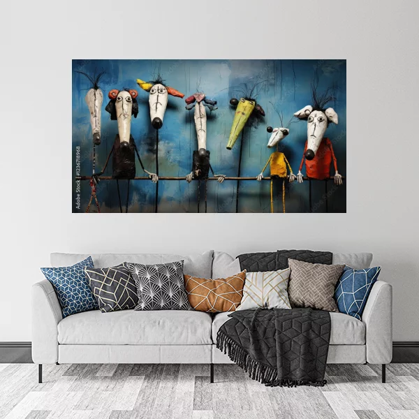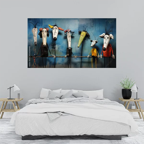 Obraz drukowany na płótnie przedstawia siedem postaci o długich nosach, ułożonych w szeregu na tle w odcieniach niebieskiego. Te unikatowe i nieco abstrakcyjne postacie nadają obrazowi niezwykły charakter, idealnie komponując się z różnorodnymi wnętrzami. Doskonale wpasuje się zarówno do salonu, jak i do sypialni, tworząc ciekawą i nowoczesną aranżację.