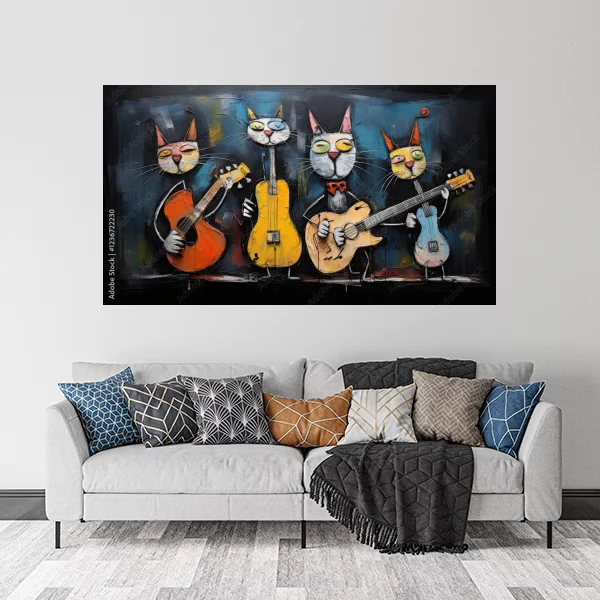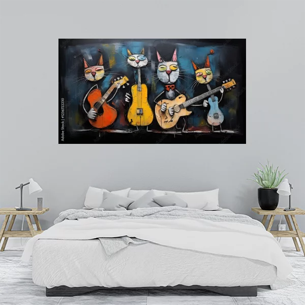 Obrazek przedstawia cztery urocze koty, każdy z gitarą, co dodaje mu artystycznego i humorystycznego charakteru. Ta kolorowa scena idealnie nadaje się jako ozdoba do wnętrz, wprowadzając do pomieszczenia ciepło i unikalny styl. Obraz można zamówić na wymiar, co pozwala dopasować go idealnie do konkretnej przestrzeni. Jest dostępny w różnych materiałach, takich jak szkło plexi, płyta PCV, płótno bawełniane, poliestrowe czy na korku, co daje szeroki wachlarz możliwości aranżacyjnych. Dodatkowo, obraz można zamówić w eleganckiej drewnianej ramie w kolorze czarnym lub naturalnym, co podkreśla jego walory estetyczne. Dzięki dostępności na płycie dibond, obraz będzie trwały i odporny na uszkodzenia. Perfekcyjnie sprawdzi się zarówno w salonie, jak i w sypialni, dodając pomieszczeniom energii i niepowtarzalnego charakteru.