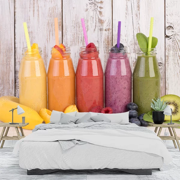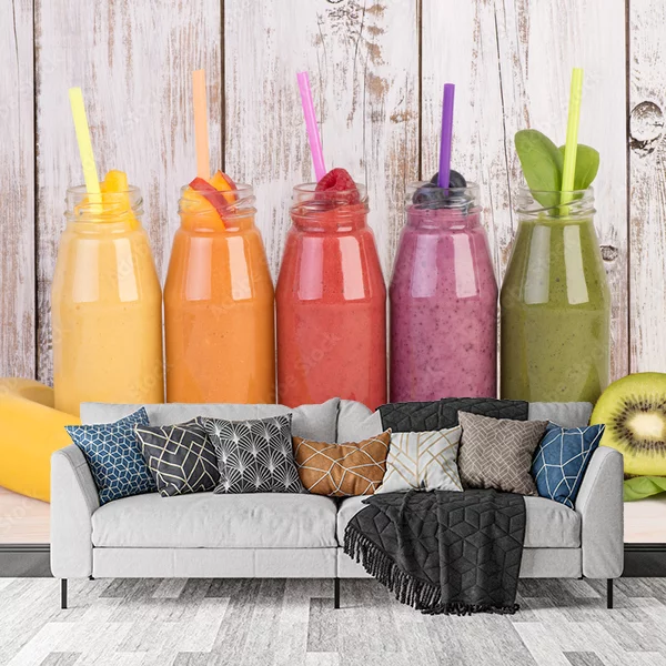 Fototapeta przedstawia pięć kolorowych smoothie w szklanych butelkach z rurkami, ustawionych w jednym rzędzie na tle jasnej, drewnianej ściany. Poszczególne smoothie mają różne kolory – żółty, pomarańczowy, czerwony, fioletowy i zielony, na co wskazują odpowiadające im owoce ułożone przed butelkami. Na pierwszym planie znajdują się świeże owoce, takie jak banan, brzoskwinia, maliny, jagody, szpinak, a także przekrojone kiwi. Całość tworzy apetyczny i energetyczny obraz, idealny jako dekoracja kuchni lub jadalni, dodając pomieszczeniu żywych kolorów i zachęcając do zdrowego stylu życia.