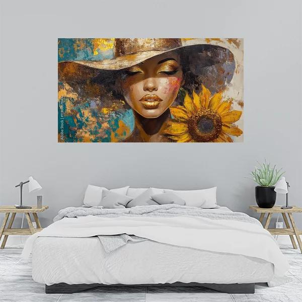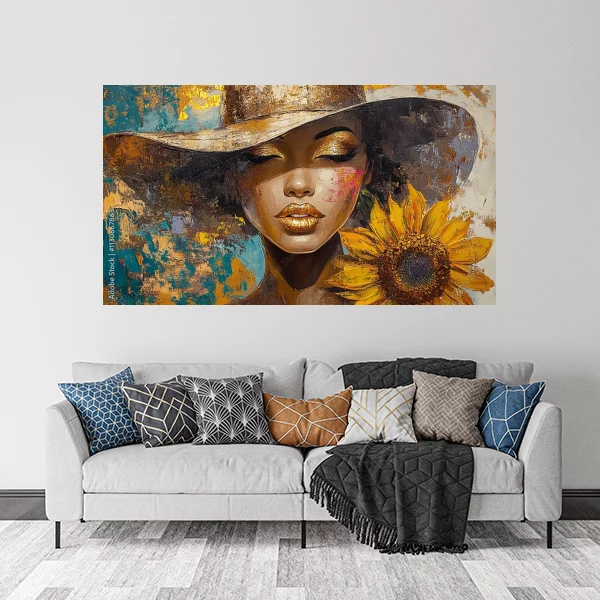 Na obrazku przedstawiona jest elegancka postać z zamkniętymi oczami, mająca na głowie stylowy kapelusz. Jej usta są pomalowane złotą pomadką, a obok twarzy trzyma piękny słonecznik, który dodaje kompozycji nasyconych kolorów i ciepła. Tło obrazu to abstrakcyjna plama kolorów, które idealnie dopełniają główny motyw.