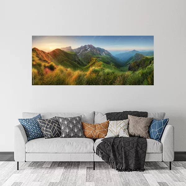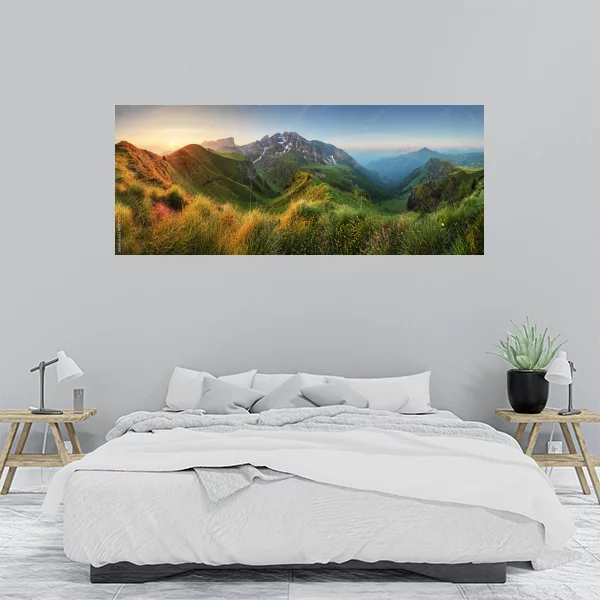 Ten urokliwy obraz drukowany na płótnie przedstawia pejzaż górski o zachodzie słońca, który doskonale wpisze się we wnętrza zarówno salonu, jak i sypialni. Dynamiczna kompozycja górskich grzbietów pokrytych soczystą zielenią sprawia, że obraz emanuje spokojem i harmonią, jednocześnie przyciągając wzrok. Ciepłe barwy zachodzącego słońca tworzą przytulną atmosferę, idealną do relaksu.