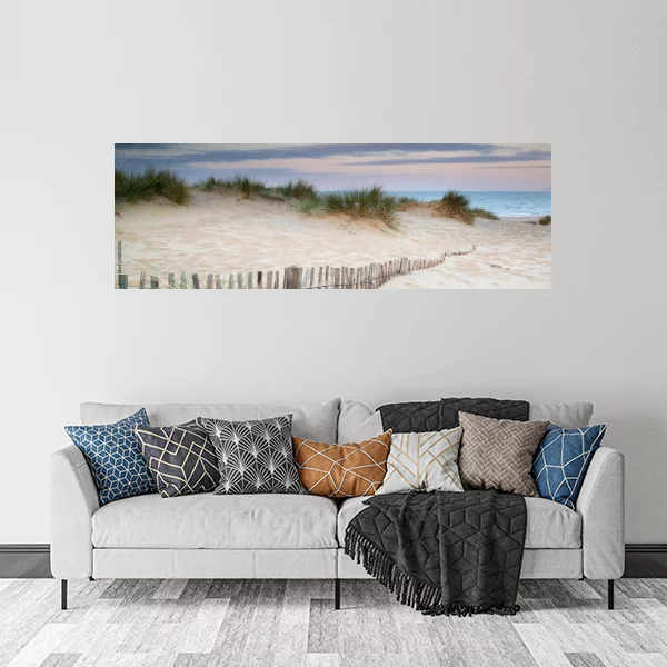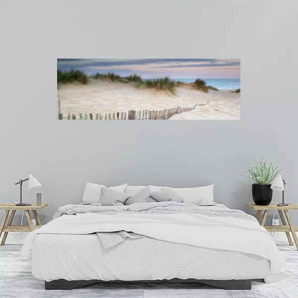 Obraz na płótnie przedstawia sielankowy krajobraz nadmorski z wydmami pokrytymi trawą oraz drewnianym płotkiem wzdłuż piasku. Scena jest wykonana w delikatnych pastelowych kolorach, z różowo-niebieskim niebem o zmierzchu. Wydmy stopniowo opadają w stronę morza, którego błękitne wody widoczne są na horyzoncie. Obraz emanuje spokojem i naturalnym pięknem wybrzeża, idealnie nadając się do wnętrz, które mają przynieść relaksującą i uspokajającą atmosferę.