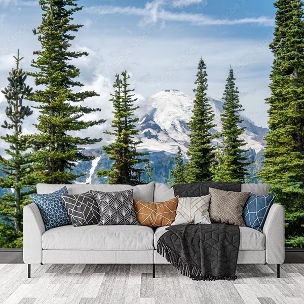 Fototapeta przedstawia malowniczy krajobraz górski. Na pierwszym planie widoczne są wysokie, zielone drzewa iglaste, które tworzą naturalną ramę dla centralnego motywu – ośnieżonego szczytu góry. W tle rozciąga się błękitne, lekko zachmurzone niebo, które dodaje głębi i spokoju kompozycji. Taka fototapeta wprowadza do wnętrza elementy natury, nadając pomieszczeniu świeżości i harmonii. Idealna do salonu lub sypialni, tworzy przestrzeń sprzyjającą relaksowi i kontemplacji.