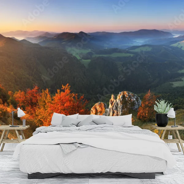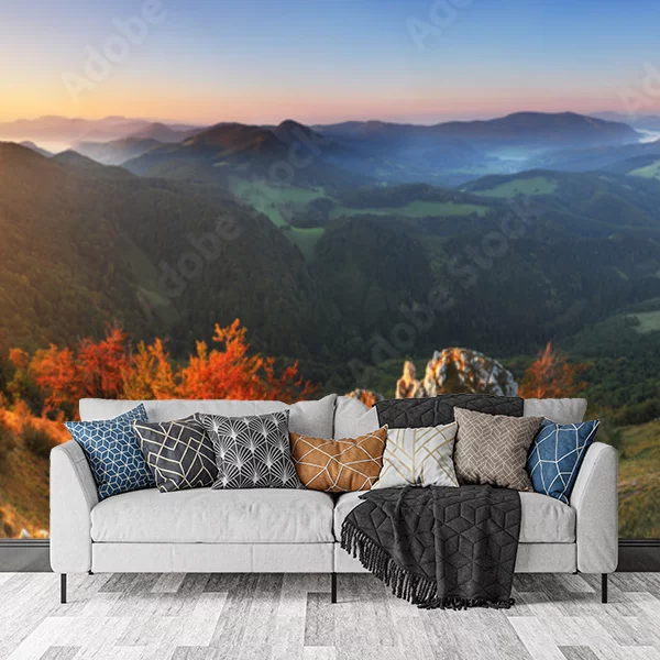 Ta fototapeta przedstawia panoramiczny widok na malowniczy krajobraz górski o wschodzie słońca. Na pierwszym planie widoczne są białe wapienne skały oraz drzewa z liśćmi w ciepłych, jesiennych kolorach. W oddali rozciągają się zielone doliny, lasy, oraz wzgórza tonące w porannej mgle. Kompozycja emanuje spokojem i naturalnym pięknem, stanowiąc doskonały element dekoracyjny, który wprowadza do wnętrza atmosferę bliskości z naturą.