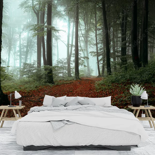 Fototapeta na wymiar przedstawia gęsty, tajemniczy las o poranku lub wieczorem. Ścieżka prowadzi przez las, pokryta jest czerwono-brązowymi liśćmi, co sugeruje jesienną porę roku. W tle widać wysokie drzewa z delikatną mgłą snującą się między nimi, dodającą atmosfery spokoju i tajemniczości. Żywe zielenie i głębokie odcienie brązu w harmonii tworzą uspokajający, ale jednocześnie intrygujący krajobraz, idealny do wnętrz, gdzie chcemy poczuć bliskość z naturą.