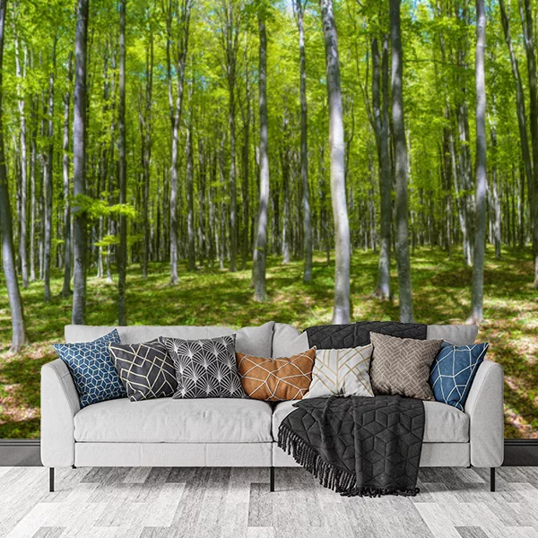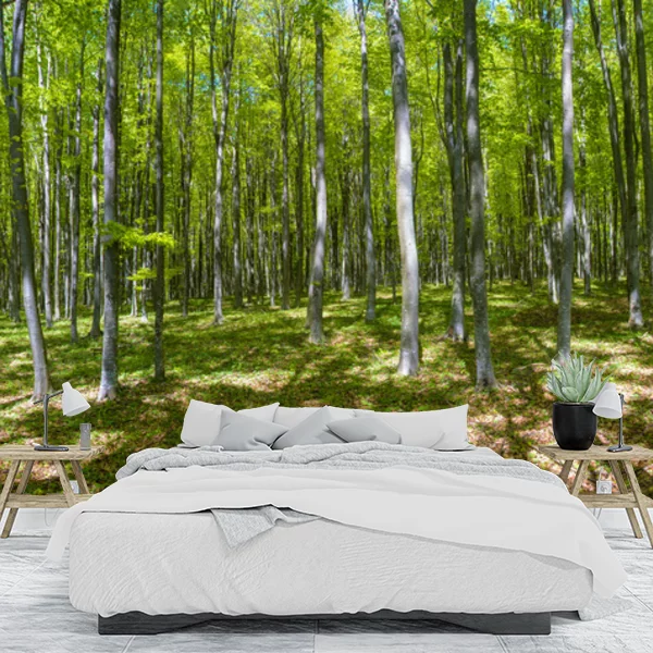 Obraz przedstawia malowniczy, zielony las liściasty, który wspaniale komponuje się jako fototapeta na ścianę. Drzewa są smukłe i wysoko pną się ku niebu, z delikatnie opadającymi liśćmi, co tworzy atmosferę spokoju i bliskości z naturą. Słońce delikatnie przenika przez korony drzew, tworząc urokliwe cienie na leśnej ściółce pokrytej liśćmi. Taka fototapeta wprowadza do wnętrza świeżość i harmonię, tworząc iluzję większej przestrzeni i kontaktu z przyrodą, idealna do salonu czy przestrzeni relaksacyjnej.