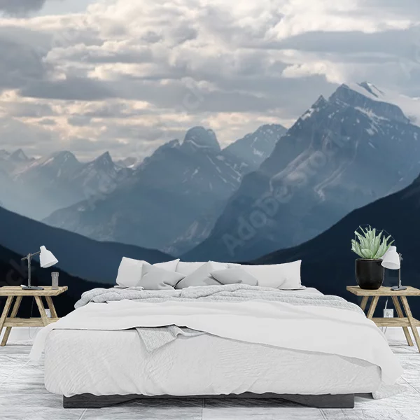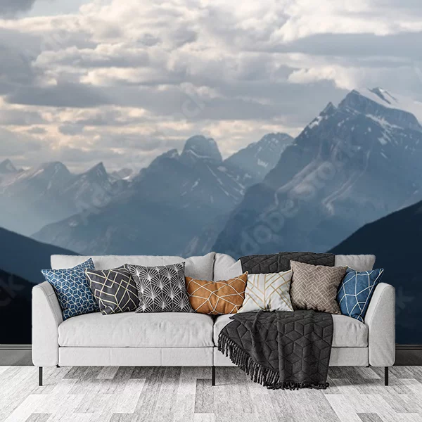 To panoramiczne ujęcie górskiego pejzażu, idealne jako fototapeta na ścianę. Obraz przedstawia majestatyczne szczyty oświetlone przez rozproszone światło wpadające przez gęste, chmurne niebo. Góry o różnorodnych kształtach i fakturach tworzą warstwy, które dodają głębi i tajemniczości. Spokojna, chłodna paleta kolorów z odcieniami szarości i błękitu dodaje wrażenia harmonii i spokoju, jednocześnie podkreślając potęgę natury. Taka fototapeta może przemienić wnętrze, nadając mu przestronności i świeżości.