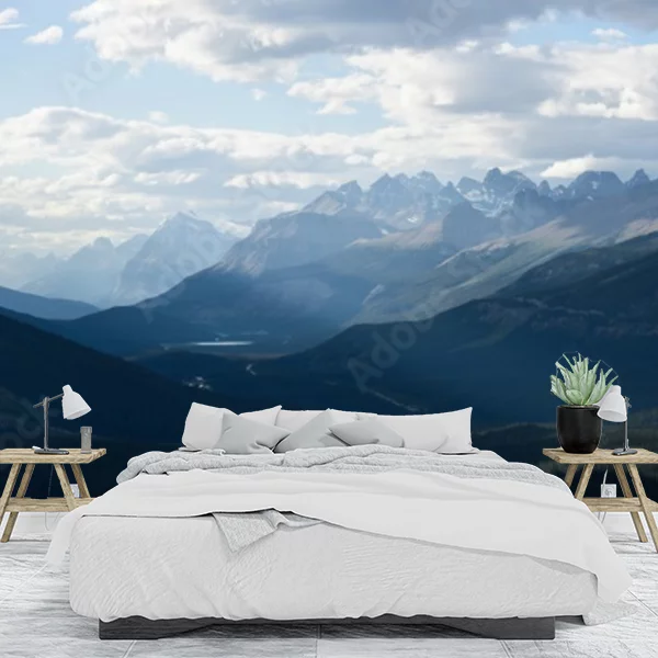 Ta fototapeta przedstawia imponujący, górski krajobraz, idealny do ozdobienia ściany. Na pierwszym planie widoczne są masywne, skaliste góry porośnięte lasami, które stopniowo przechodzą w bardziej odległe, mgliście zarysowane szczyty w tle. Jasne światło i miękkie chmury na niebie nadają obrazowi spokojny, ale jednocześnie majestatyczny charakter. Całość tworzy harmonijną scenę, która może wprowadzić spokój i przestrzeń do wnętrza.