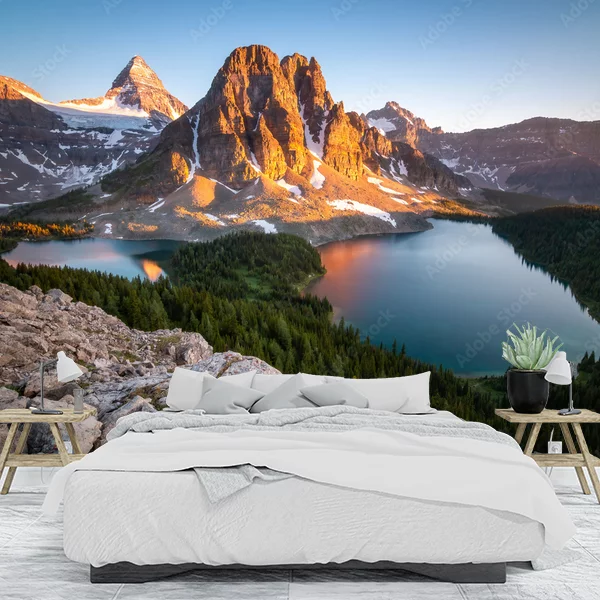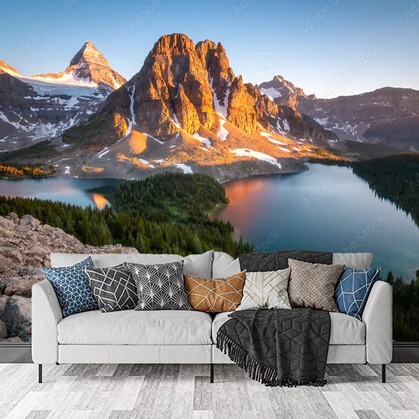 Ten obraz idealny na fototapetę przedstawia malowniczy krajobraz górski oświetlony ciepłym światłem zachodzącego słońca. W centrum sceny widać majestatyczne, skaliste szczyty pokryte śniegiem. Na pierwszym planie znajduje się turkusowe jezioro otoczone bujnym lasem, a w oddali rozciągają się kolejne pasma górskie. Całość tworzy harmonijną i spokojną atmosferę, idealną do wprowadzenia odrobiny natury do wnętrza.