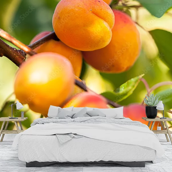 Na obrazie widać gałąź z dojrzałymi owocami moreli. Morele mają soczysto-pomarańczowy kolor z delikatnie czerwonymi rumieńcami, co nadaje im apetycznego wyglądu. W tle widoczne są zielone liście drzewa, które tworzą naturalne, miękkie tło. Obraz jest ciepły i nasycony, co sprawia, że jest idealnym motywem na fototapetę na ścianę. Taka dekoracja wnętrza mogłaby ożywić przestrzeń, dodając jej naturalnego, świeżego klimatu.