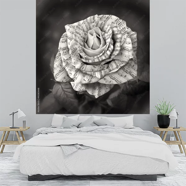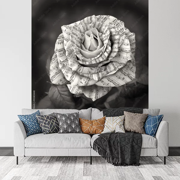 Obraz przedstawia różę wykonaną z papieru z naniesionymi nutami muzycznymi. Kwiat ma realistyczny wygląd, jednak każdy jego płatek jest pokryty fragmentami partytury. Całość utrzymana jest w czarno-białej tonacji, co nadaje kompozycji elegancji i klasycznego charakteru. Tło jest delikatnie rozmyte, co podkreśla główny motyw obrazu. Idealnie nadaje się na ścianę dla miłośników muzyki i sztuki.