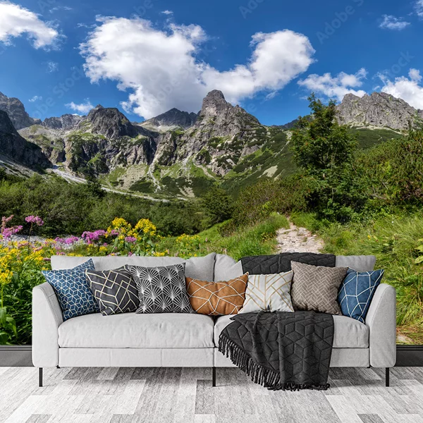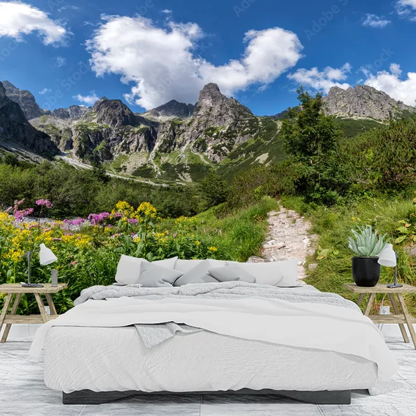 Fototapeta przedstawia malowniczy górski krajobraz. Na pierwszym planie znajduje się kamienista ścieżka, otoczona soczyście zieloną roślinnością i barwnymi kwiatami. W oddali widać majestatyczne szczyty górskie wznoszące się pod błękitnym, bezchmurnym niebem z białymi obłokami. Scena emanuje spokojem i zachwyca naturalnym pięknem, idealnie nadając się jako dekoracja na ścianę, wprowadzająca atmosferę relaksu i bliskości natury do wnętrza.