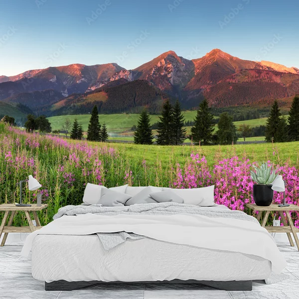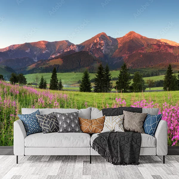 Fototapeta przedstawia malowniczy krajobraz górski oświetlony ciepłym światłem zachodzącego słońca. Na pierwszym planie widoczne są pola pełne fioletowych kwiatów, które dodają uroku i koloru scenie. W oddali znajdują się majestatyczne góry, których szczyty są delikatnie podświetlone przez słońce. Widać także lasy iglaste rosnące w dolinach, nadające głębi i kontrastu całemu widokowi. Błękitne niebo z lekkimi odcieniami różu i pomarańczu dopełnia spokojną i harmonijną atmosferę. Taki obraz w postaci fototapety wprowadzi do wnętrza poczucie przestrzeni i naturalnego piękna.