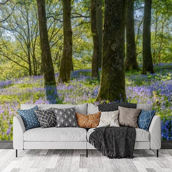 Ten obraz przedstawia malowniczą leśną scenerię z dywanem pełnym niebieskich dzwonków. Drzewa są smukłe, z rozłożystymi gałęziami, przez które prześwituje słoneczne światło, tworząc delikatne cienie na podłożu. Niebieskie kwiaty, które pokrywają całą leśną polanę, tworzą spokojną i malowniczą atmosferę, idealną do zrelaksowania się. Jasne barwy i naturalne piękno tego krajobrazu sprawiają, że byłby on znakomitą fototapetą, dodającą przestrzeni świeżości i elegancji.