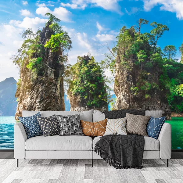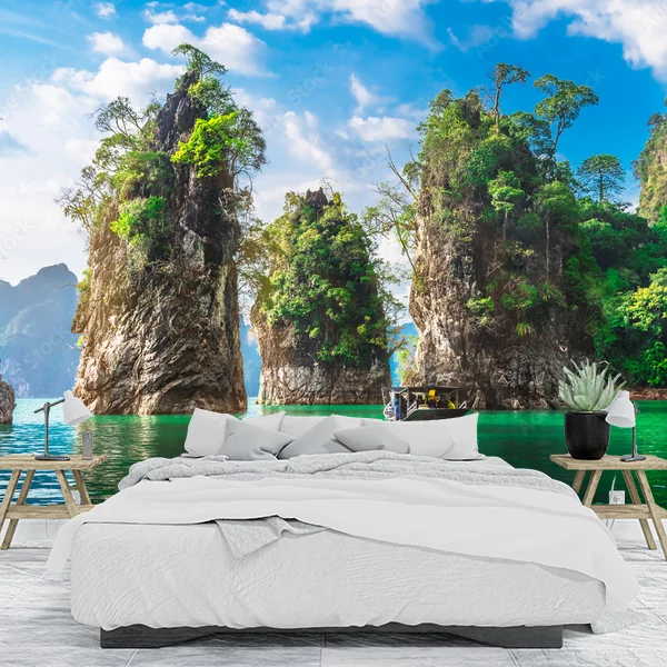 Fototapeta przedstawia idylliczny krajobraz z turkusową wodą jeziora. Na pierwszym planie znajdują się majestatyczne, strzeliste formacje skalne porośnięte bujną roślinnością. W tle widać błękitne niebo z białymi chmurami. Pomiedzy skałami płynie łódź, dodając dynamiki i życia temu spokojnemu otoczeniu. Całość emanuje atmosferą spokoju i egzotyki, idealnie nadając się do stworzenia relaksującej przestrzeni w domu.