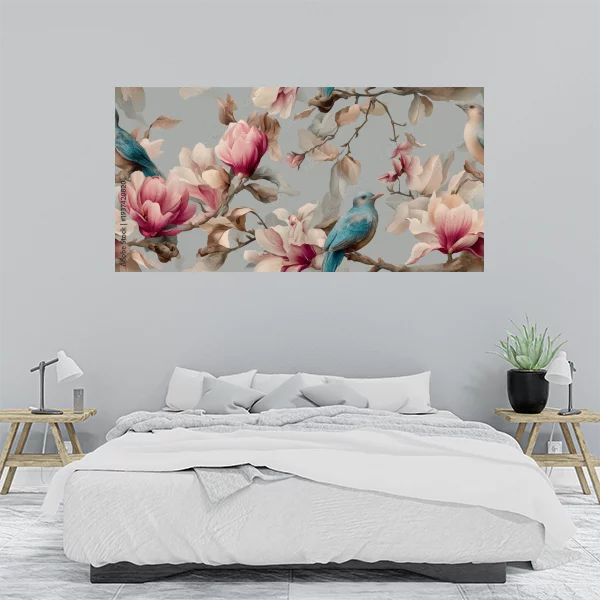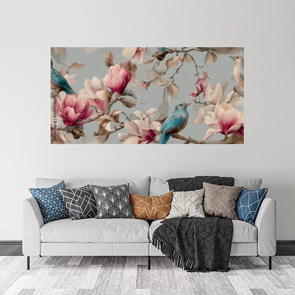 Ten zachwycający obraz przedstawia delikatną kompozycję ptaków i kwiatów magnolii na subtelnym, szarym tle. Jego romantyczny charakter sprawia, że jest idealnym dodatkiem do wnętrz, nadając przestrzeni elegancji i spokoju. W salonie będzie stanowił wyrafinowany akcent dekoracyjny, przyciągając wzrok i dodając głębi przestrzeni. W sypialni wprowadzi atmosferę relaksu i harmonii.