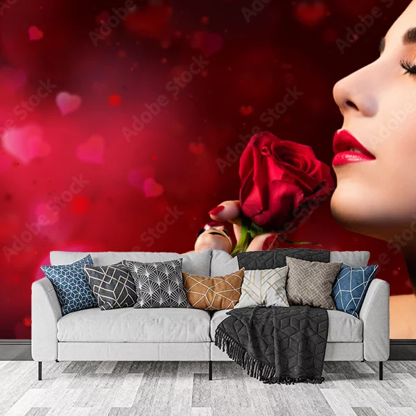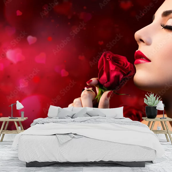 Obraz przedstawia elegancką kobietę z zamkniętymi oczami, trzymającą czerwoną różę przy twarzy. Tło jest głęboko czerwone, z delikatnymi bokeh w kształcie serc, co dodaje romantycznego nastroju. Usta kobiety są pomalowane na czerwono, a także ma subtelny makijaż oczu oraz kolczyki w kształcie czerwonych serc. Ta kompozycja może stanowić atrakcyjną fototapetę na ścianę, wprowadzając do wnętrza elegancję i romantyczną atmosferę.