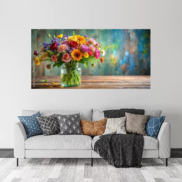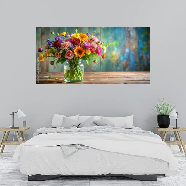 Ten uroczy obrazek przedstawia bukiet kwiatów w szklanym wazonie, umieszczony na drewnianym stole. Tło z delikatnymi, niebiesko-zielonymi tonami dodaje dziełu głębi i uroku. Taki wydruk na płótnie doskonale nadaje się do wnętrz, dodając im świeżości i naturalnego piękna. Idealnie pasuje zarówno do salonu, jak i do sypialni, wnosi ciepło i przytulność do każdego pomieszczenia.