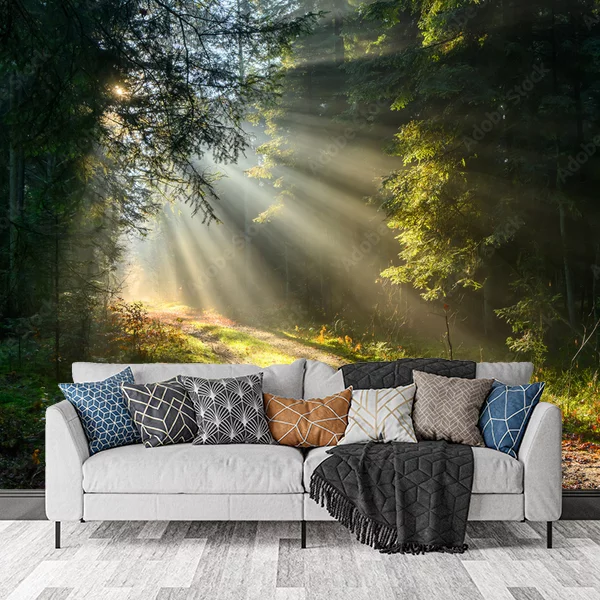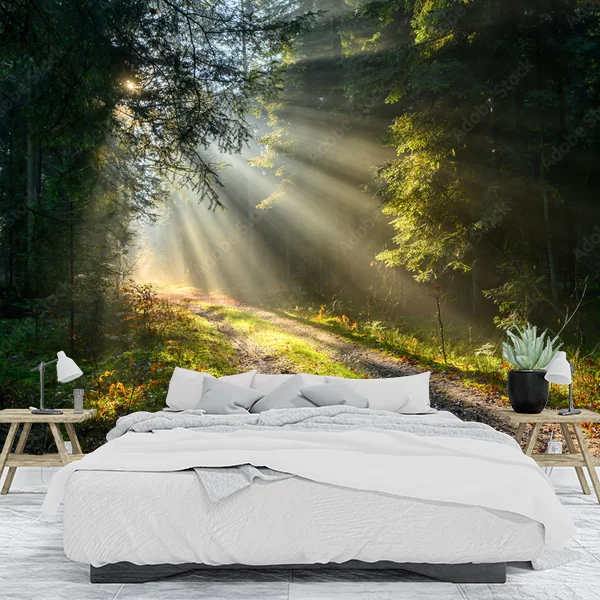 Fototapeta przedstawia malowniczy, leśny krajobraz. Promienie słońca przedzierają się przez gęste korony drzew, tworząc piękną grę światła i cienia na ścieżce prowadzącej w głąb lasu. Światło podkreśla różnorodność zieleni i subtelne detale leśnej roślinności. Całość emanuje spokojem i zachęca do chwili kontemplacji w otoczeniu natury. To idealna dekoracja na ścianę, która wprowadzi do wnętrza atmosferę relaksu i kontaktu z przyrodą.