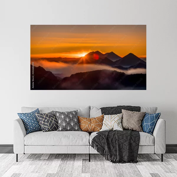 Obraz przedstawia malowniczy zachód słońca nad górzystym krajobrazem. W tle widać góry, które są delikatnie otulone mgłą, co dodaje scenerii mistycznego klimatu. Ciepłe, złote i pomarańczowe barwy nieba kontrastują z ciemniejszymi zarysami gór, co tworzy harmonijną kompozycję. Promienie słońca przedzierają się przez niskie chmury, dodając obrazowi dynamizmu i głębi. Taki pejzaż idealnie nadaje się na dekorację ściany, wprowadzając do wnętrza spokój i piękno natury.