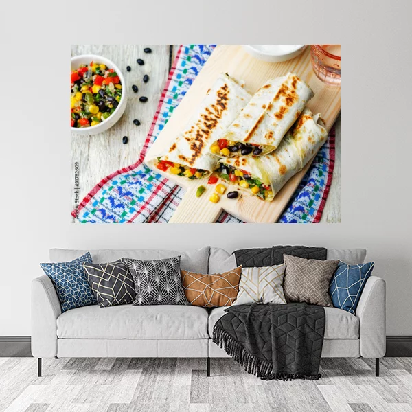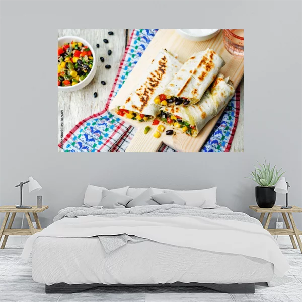 Na obrazie przedstawione są apetyczne, grillowane burrito ułożone na drewnianej desce do krojenia. Burrito wypełnione są kolorowymi składnikami takimi jak kukurydza, czarna fasola, kawałki pomidora oraz zielona papryka. Obok na desce znajdują się rozsypane ziarenka kukurydzy i czarnej fasoli. W tle widoczna jest miseczka z dodatkowym nadzieniem oraz naczynie z sosem, prawdopodobnie śmietaną. Tło stanowi drewniany stół, na którym leży kolorowa serwetka w kratkę, co nadaje obrazowi domowego i rustykalnego charakteru. Kolory na obrazie są żywe i kontrastowe, co sprawia, że przedstawione jedzenie wygląda bardzo apetycznie i zachęcająco.